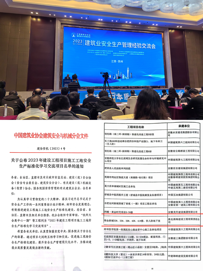 12月15日,由中國建筑業(yè)協(xié)會建筑安全與機械分會主辦的2023年建筑安全生產(chǎn)管理經(jīng)驗交流會在蘇州召開,淮海建工公司綠金新城二期工程獲評全國建設(shè)工程項目施工安全標準化項目。這是該工程在獲評淮北市建筑安全生產(chǎn)標準化示范工地、安徽省建筑安全生產(chǎn)標準化示范工地等榮譽后獲得的又一殊榮,為目前國家建設(shè)部批準的全國范圍內(nèi)建筑安全文明施工領(lǐng)域的高級別獎項。