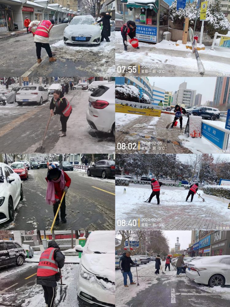 工作人員帶著鐵鍬雪鏟,充分發(fā)揮黨員模范帶頭作用,不畏嚴(yán)寒、沖鋒在前,積極參與除雪融冰、道路清潔。每個人分區(qū)清掃停車場出入口和路面人行道上的積雪,針對已經(jīng)結(jié)冰的路面,工作人員使用除冰劑進(jìn)行清除。大家齊心協(xié)力,為停車場及路面車道車輛出入開辟了一條安全暢通路。