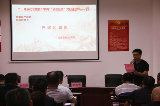活動內(nèi)容包括:紀念建黨97周年“誦讀經(jīng)典”活動、“不忘初心,牢記使命”重溫入黨誓詞、觀看“中國碳谷·綠金淮北”紀錄片、“書記上黨課”活動等,談感受、談體會。