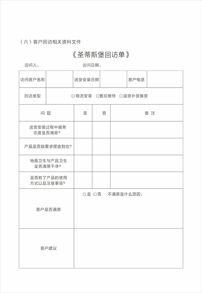 告別之前:告知客戶圣蒂斯堡全國免費(fèi)服務(wù)電話(售后服務(wù)貼)以及保修方式,請(qǐng)客戶在《產(chǎn)品配送單》上簽名,并填寫《配送滿意度調(diào)查表》后,合影留念。