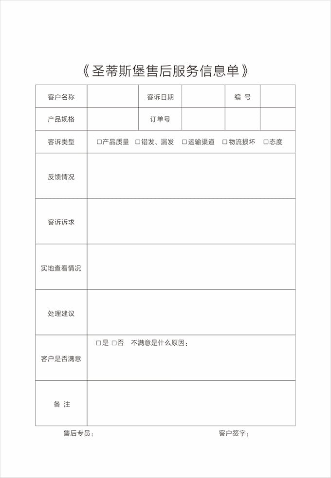 現(xiàn)場(chǎng)修復(fù)完成后,請(qǐng)客戶確認(rèn),在《圣蒂斯堡售后服務(wù)信息單》上簽字;不能現(xiàn)場(chǎng)修復(fù)時(shí)則必須跟客戶說明清楚,征得客戶同意后將產(chǎn)品帶回處理或返廠處理,應(yīng)開具相關(guān)收據(jù)交予顧客,并且登記備案;修理完畢后按照配送流程送到顧客家后應(yīng)向顧客索回收據(jù),并且請(qǐng)顧客在《圣蒂斯堡售后服務(wù)信息單》簽字。