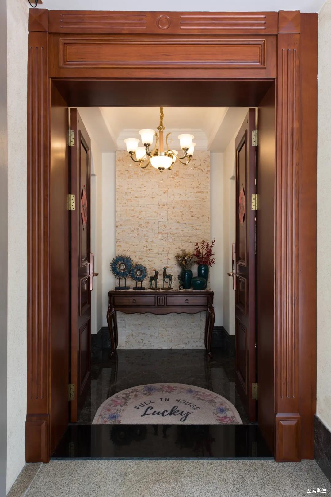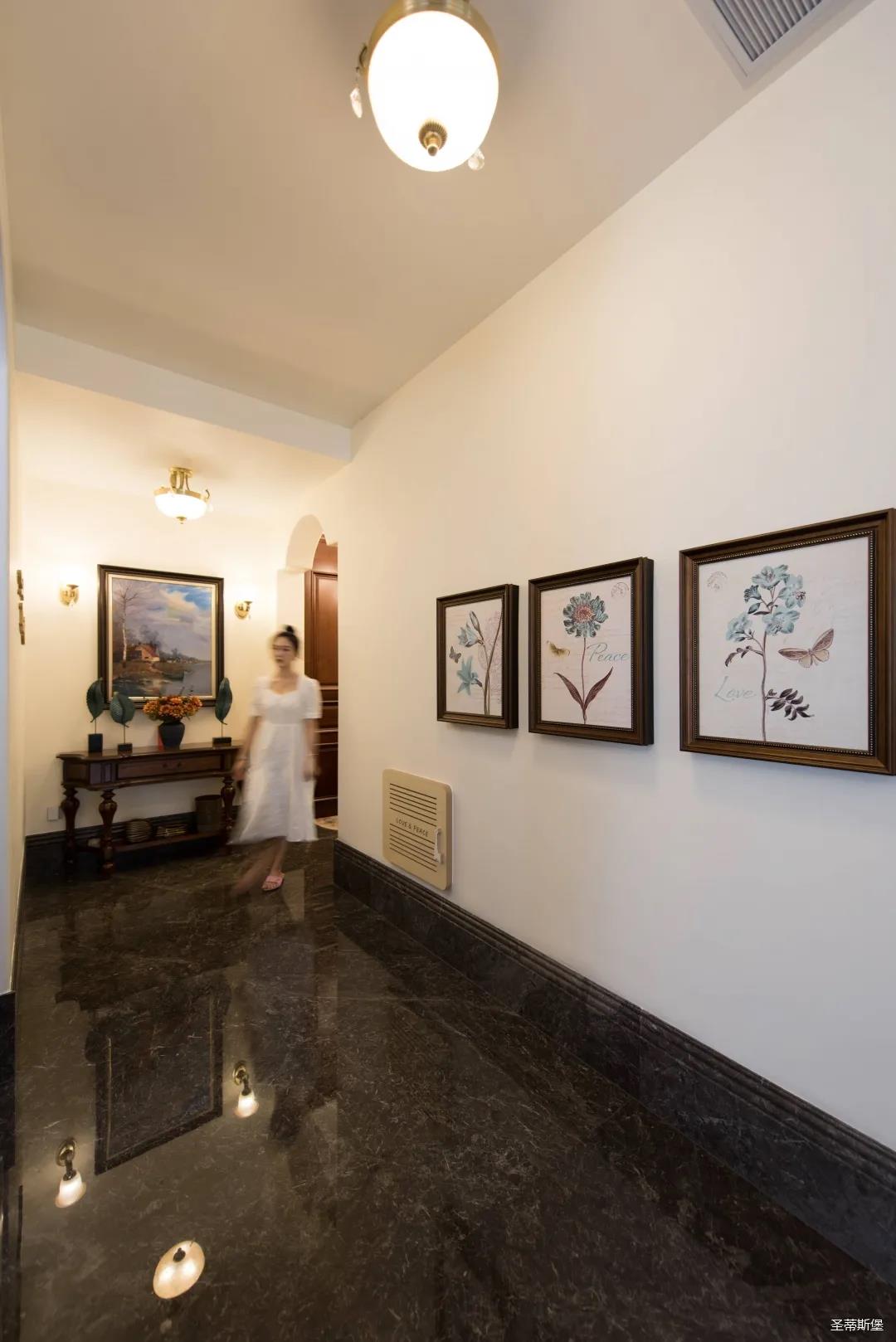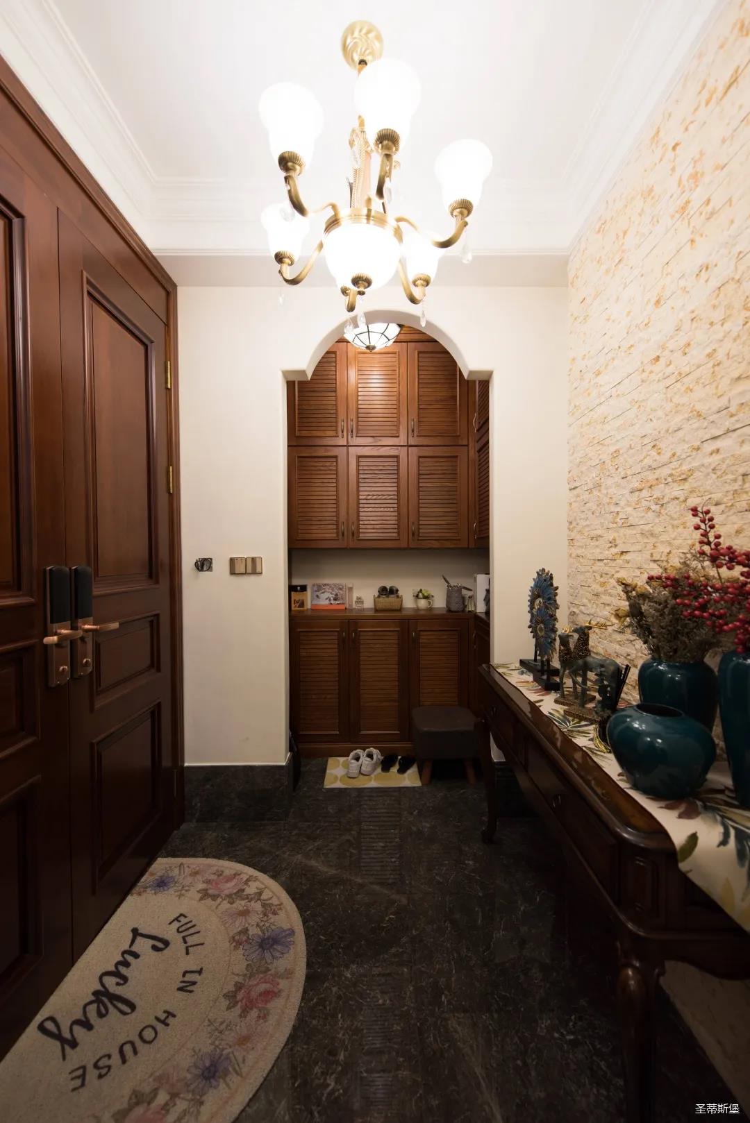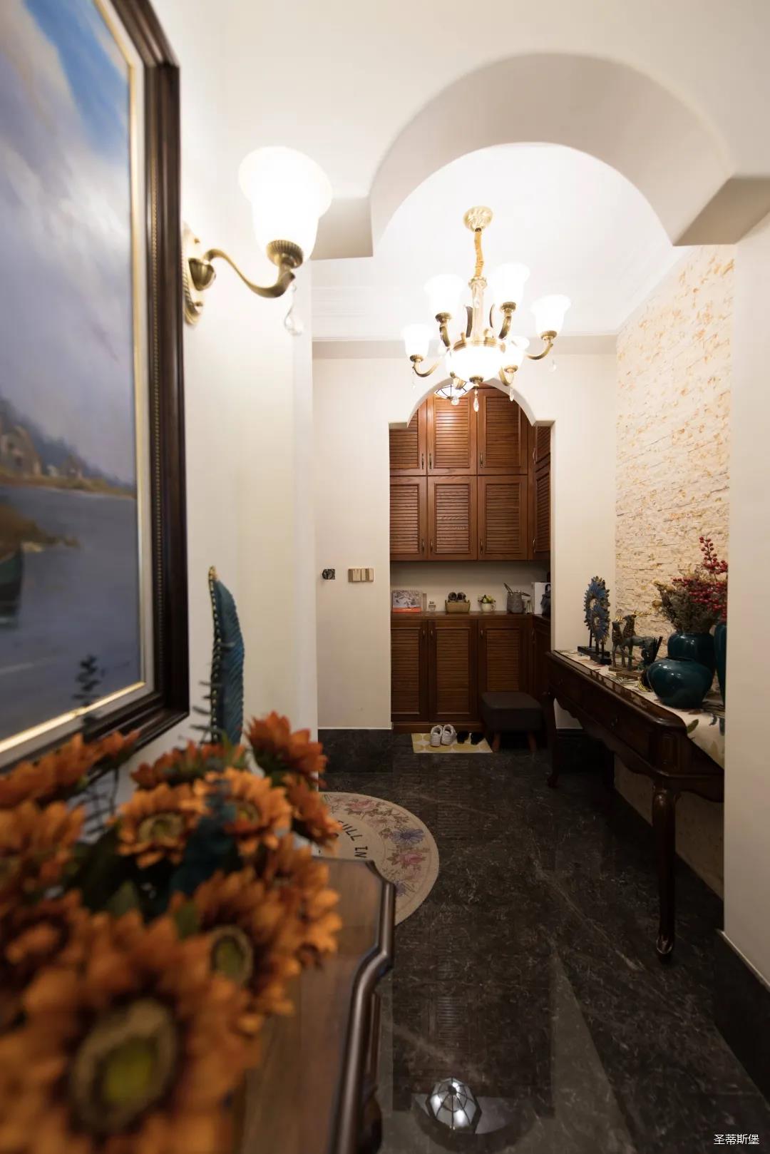 入戶玄關(guān)雙開門設(shè)計(jì),儀式感滿滿!地面定制的瓷磚貼花設(shè)計(jì),典雅又大方。核桃實(shí)木玄關(guān)桌,加上精致的擺件,經(jīng)典美式復(fù)古吊燈,不著痕跡的展現(xiàn)出居者對(duì)生活的激情,魅力吸睛,從入戶開始感受古典氛圍。
