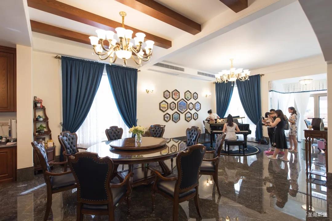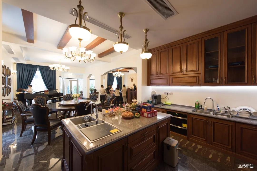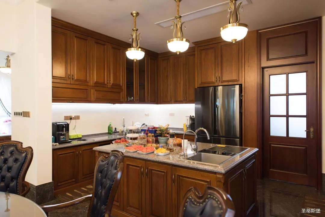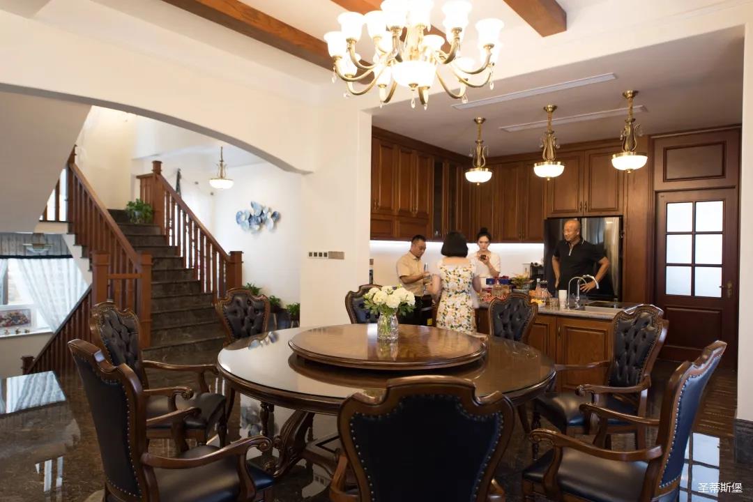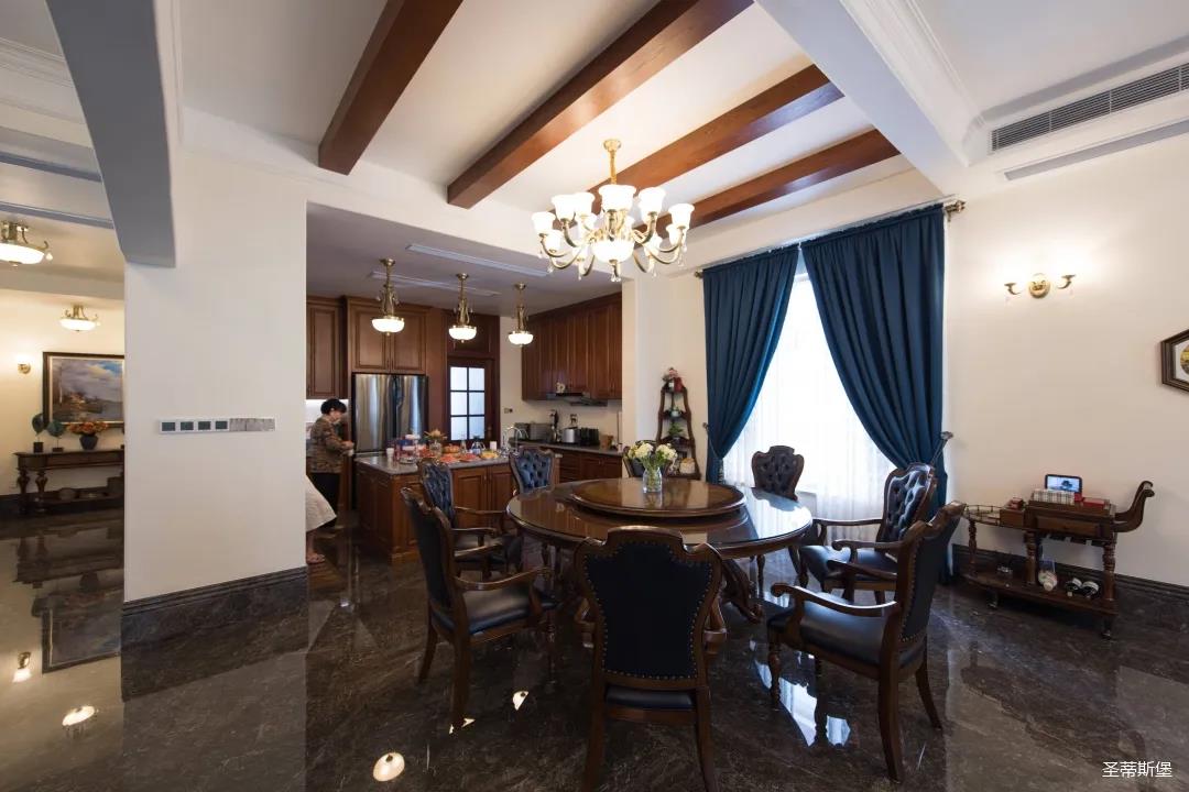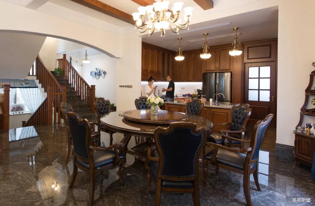 玄關(guān)進(jìn)入轉(zhuǎn)角處,以穩(wěn)重大氣實(shí)木為主色調(diào)的開放式中西餐廚空間,將一體化無(wú)隔斷設(shè)計(jì)貫徹到每個(gè)細(xì)節(jié),采用了親膚真皮質(zhì)感的餐椅,手工雕刻的曲線讓原本硬朗的空間變得格外優(yōu)雅,自上而下,構(gòu)成完整的美式空間氣度,在每天的生活點(diǎn)滴間,沉浸在美式風(fēng)情中,更加隨性舒適。