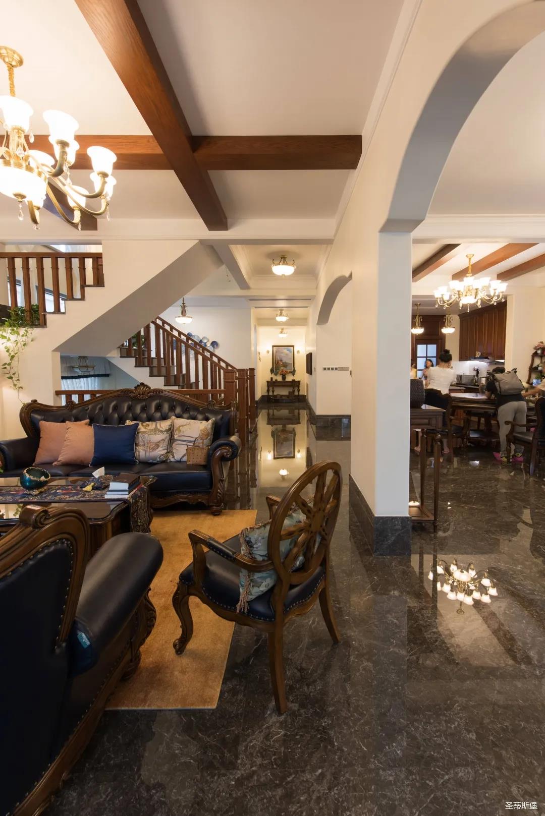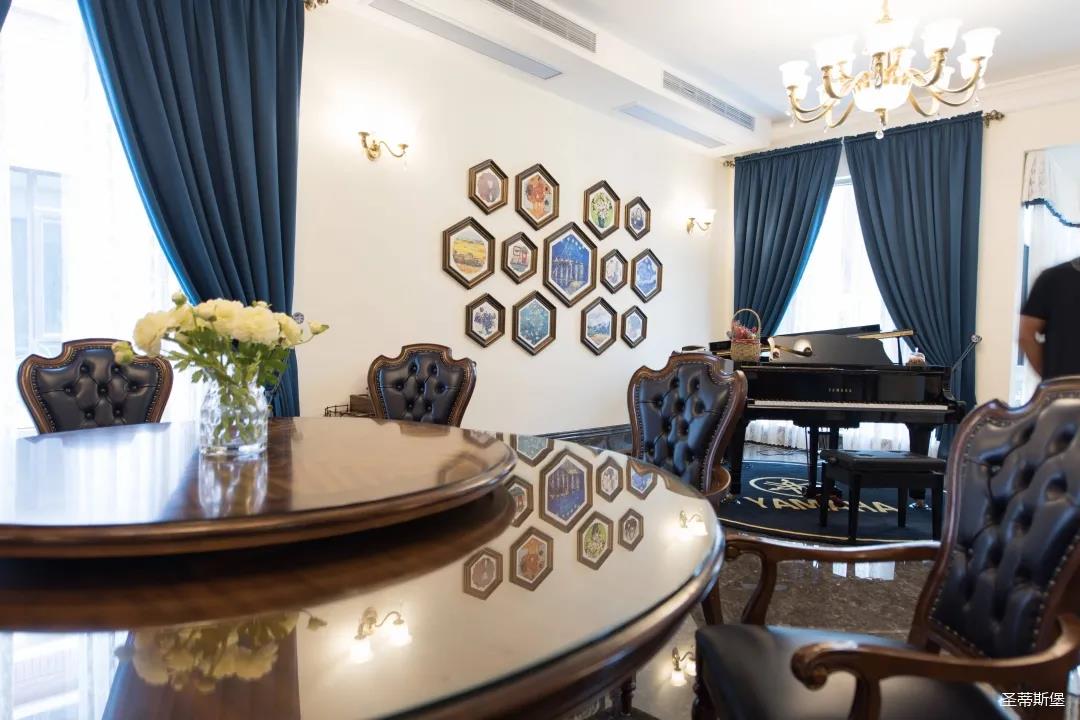 業(yè)主喜歡沉穩(wěn)的美式新古典風(fēng)格,整體統(tǒng)一的色調(diào),呈現(xiàn)了一種莊重的典雅感。醇厚的實(shí)木真皮沙發(fā),以古典的手法描繪出一種略帶復(fù)古的時(shí)尚奢華。一抹深藍(lán)迂回婉轉(zhuǎn)映照著空間的色系,明暗相對(duì),符合著現(xiàn)代審美,卻又不顯沉悶。轉(zhuǎn)角處的一臺(tái)復(fù)古唱片機(jī),還原了對(duì)音樂(lè)傾心的浪漫,抬起撥桿將唱針落下,隨著唱片的轉(zhuǎn)動(dòng)和音樂(lè)的響起,美好的一天就此開始。