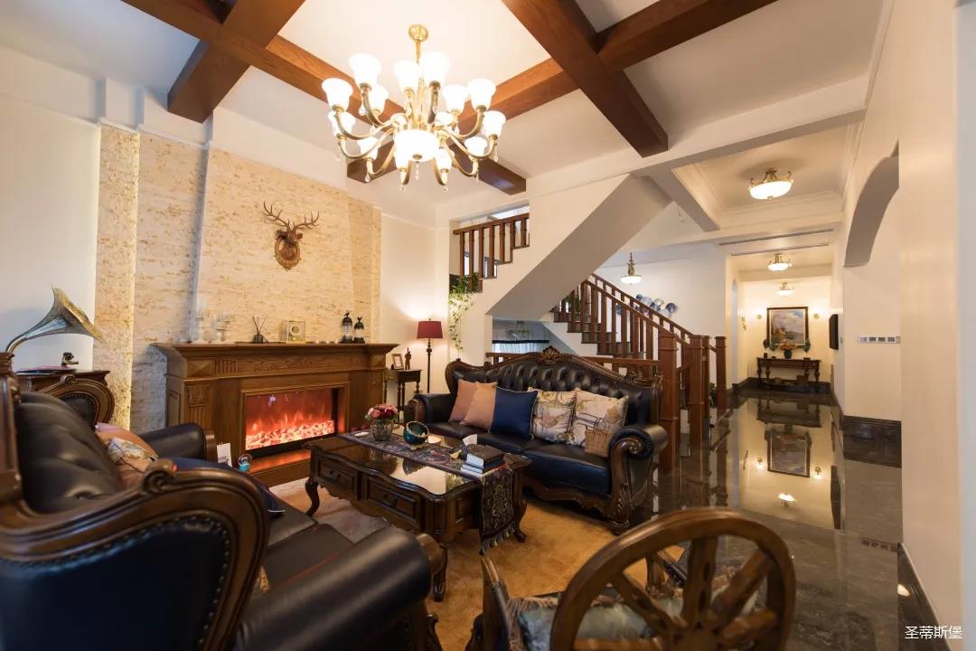 歐美實(shí)木吊頂設(shè)計(jì),與沙發(fā)茶幾上下呼應(yīng),相得益彰,提升了空間層次感。