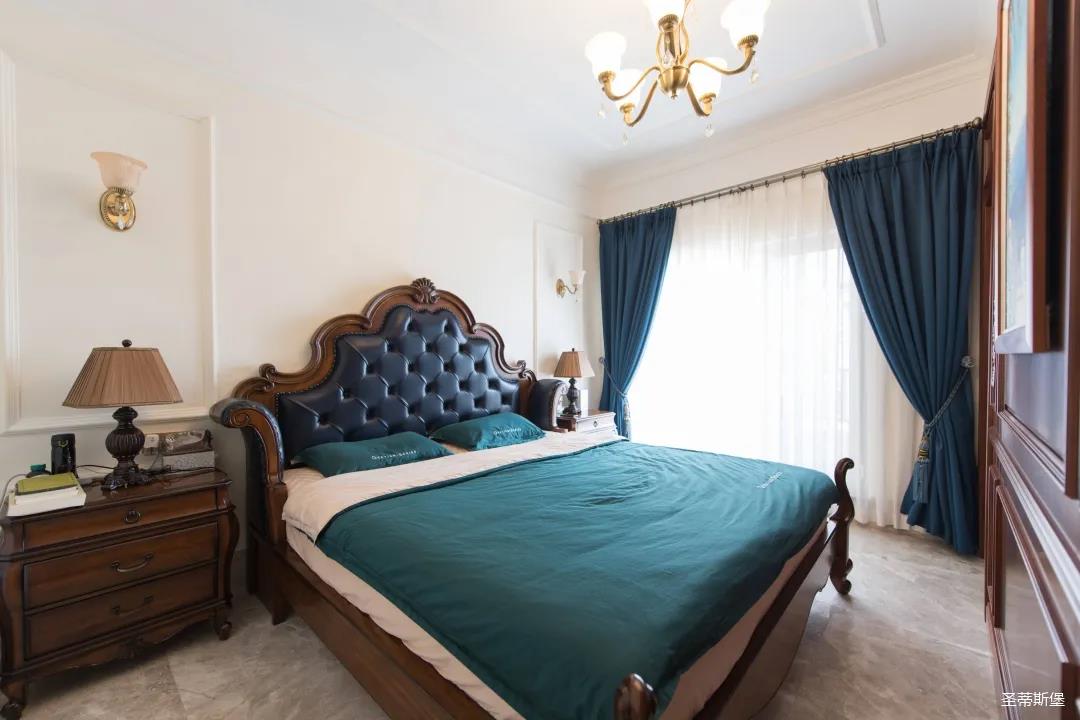 三樓是兩間臥房,每一間臥室都有自己的特定屬性。主人房端莊優(yōu)雅,雍容盡顯;墻面以簡(jiǎn)潔的美式石膏線修飾,波浪形的實(shí)木床屏上點(diǎn)綴著太陽(yáng)形狀的手工雕花,宛如海平面上剛出升的太陽(yáng),讓整個(gè)空間色彩奔放。