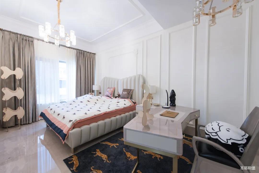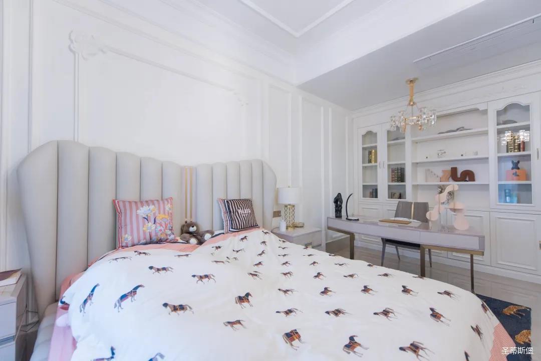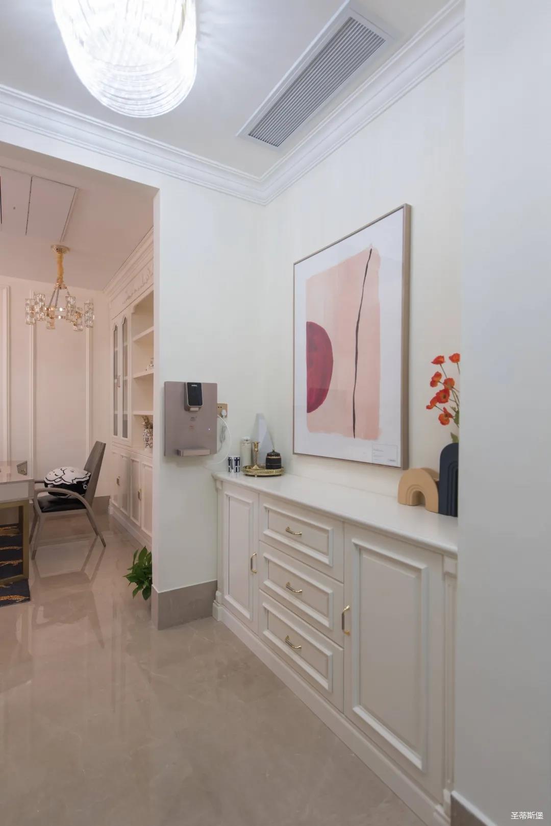 經(jīng)過(guò)房間玄關(guān)過(guò)道,一眼就被這夢(mèng)幻的景象給征服,摒棄繁雜,少許的金色元素點(diǎn)綴,予以空間輕奢細(xì)膩的質(zhì)感,卻又不失美式韻味。
