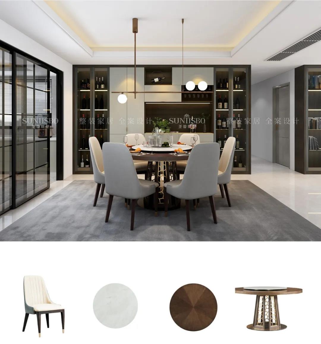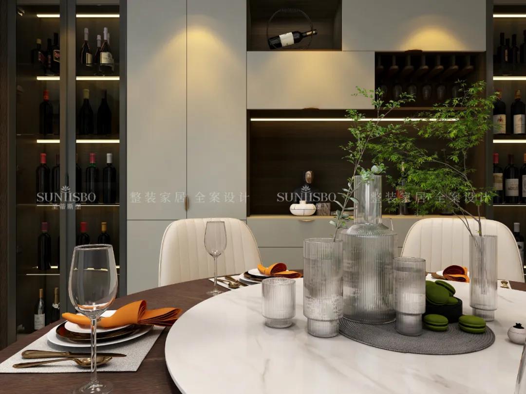 移步到餐廳空間,餐邊柜立面簡致,紋理細(xì)膩,展示區(qū)合理分配,增強(qiáng)了空間層次感,彰顯出飽滿的意式美感。實(shí)木柜面加以金屬拉手的裝飾,將極簡現(xiàn)代與高端質(zhì)感融合,以簡約的形式表達(dá)出“簡而不失其華”的感染力。