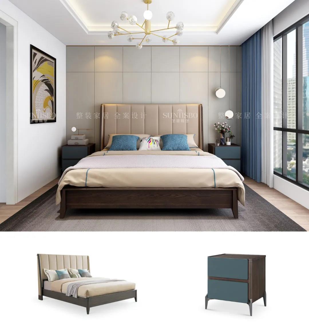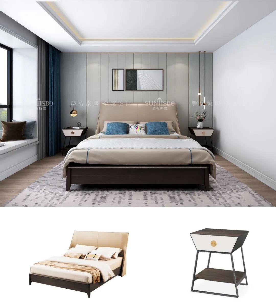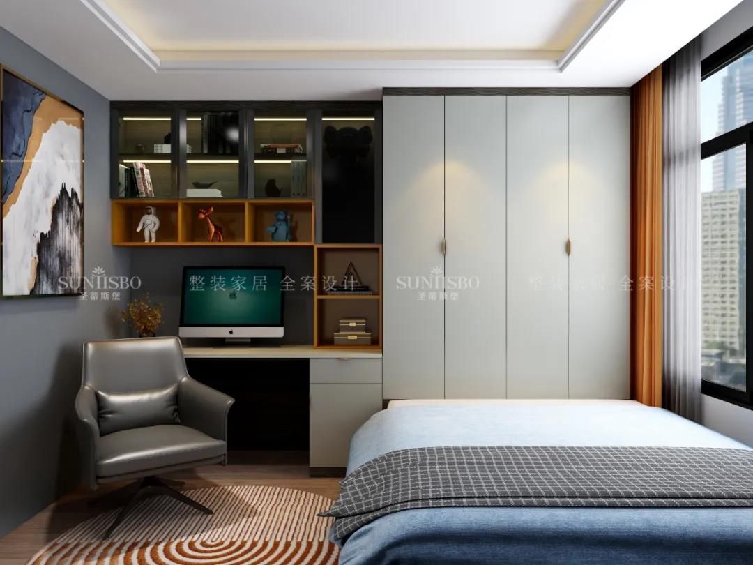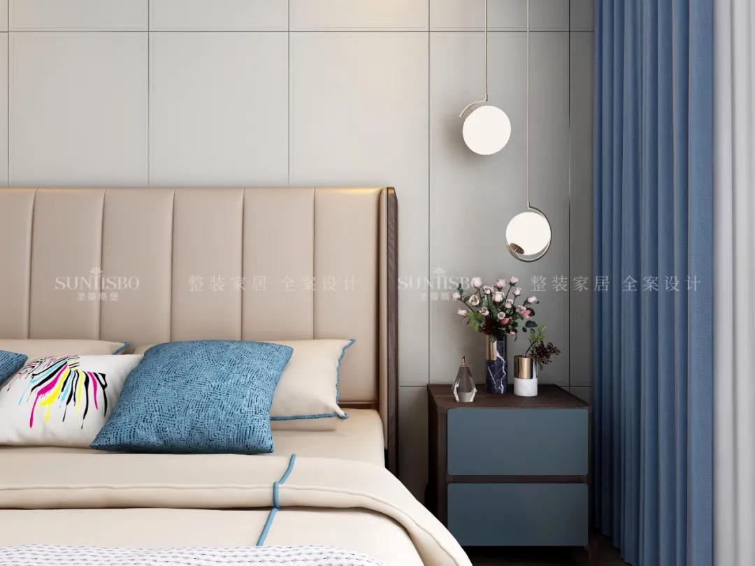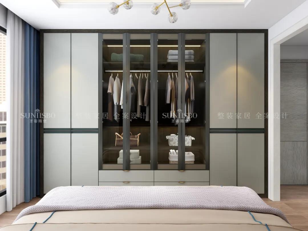 設(shè)計(jì)師運(yùn)用最為百搭淺灰實(shí)木護(hù)墻板打造主臥空間,簡約的線條縱橫交錯,帶來了干凈、清爽、舒適的視覺效果。明暗分區(qū)的衣柜在燈光的渲染下,虛實(shí)光影變換其中,為每個角落氤氳出浪漫的氣息。