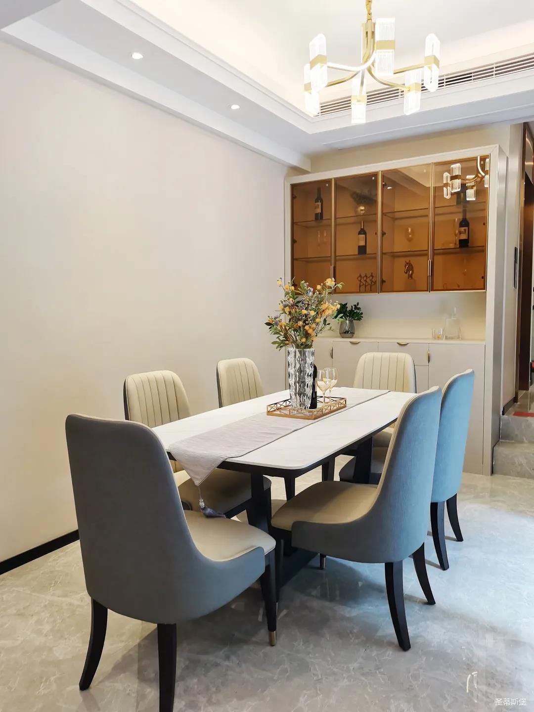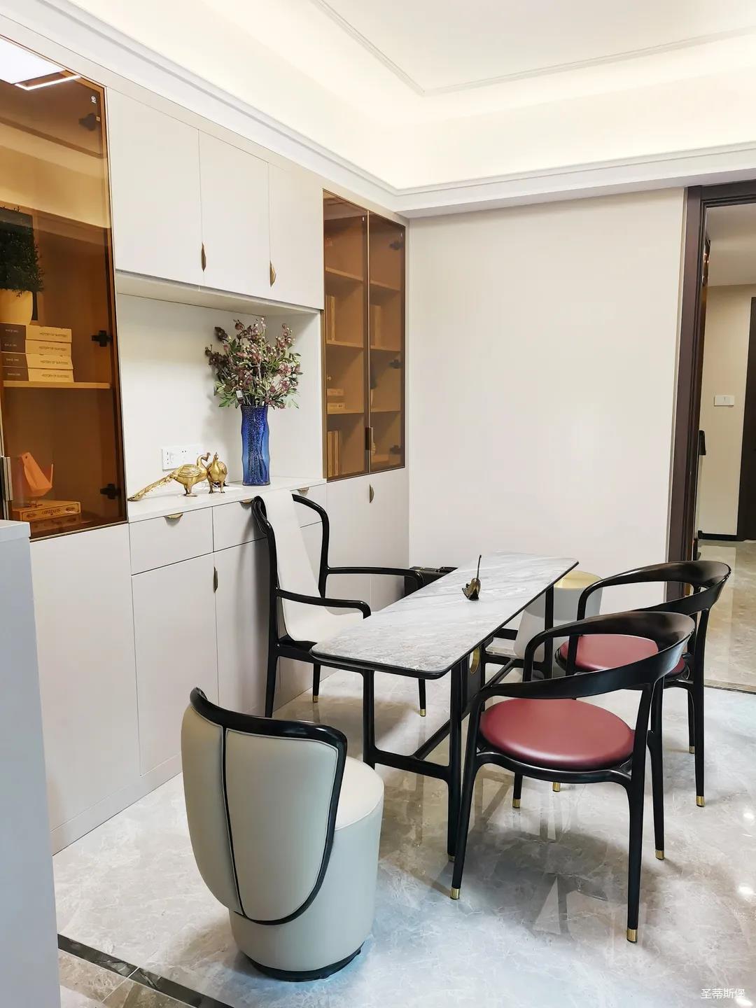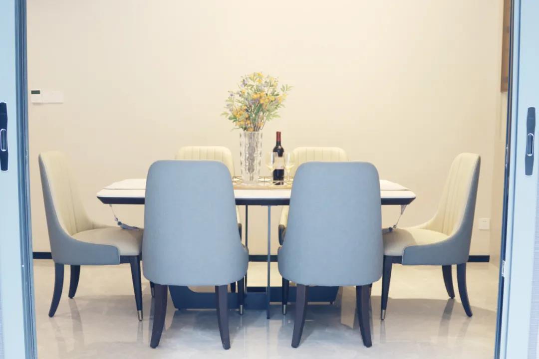 客餐廳雖屬同層,但由廊道隔開(kāi),各有寬闊的空間格局,加上引入自然光源的采光設(shè)計(jì),空間通透明亮。巖板餐桌搭配的真皮餐椅,讓不同的材質(zhì)在在空間完美契合,既增加了空間的時(shí)尚氛圍,也能給人良好的用餐體驗(yàn)。