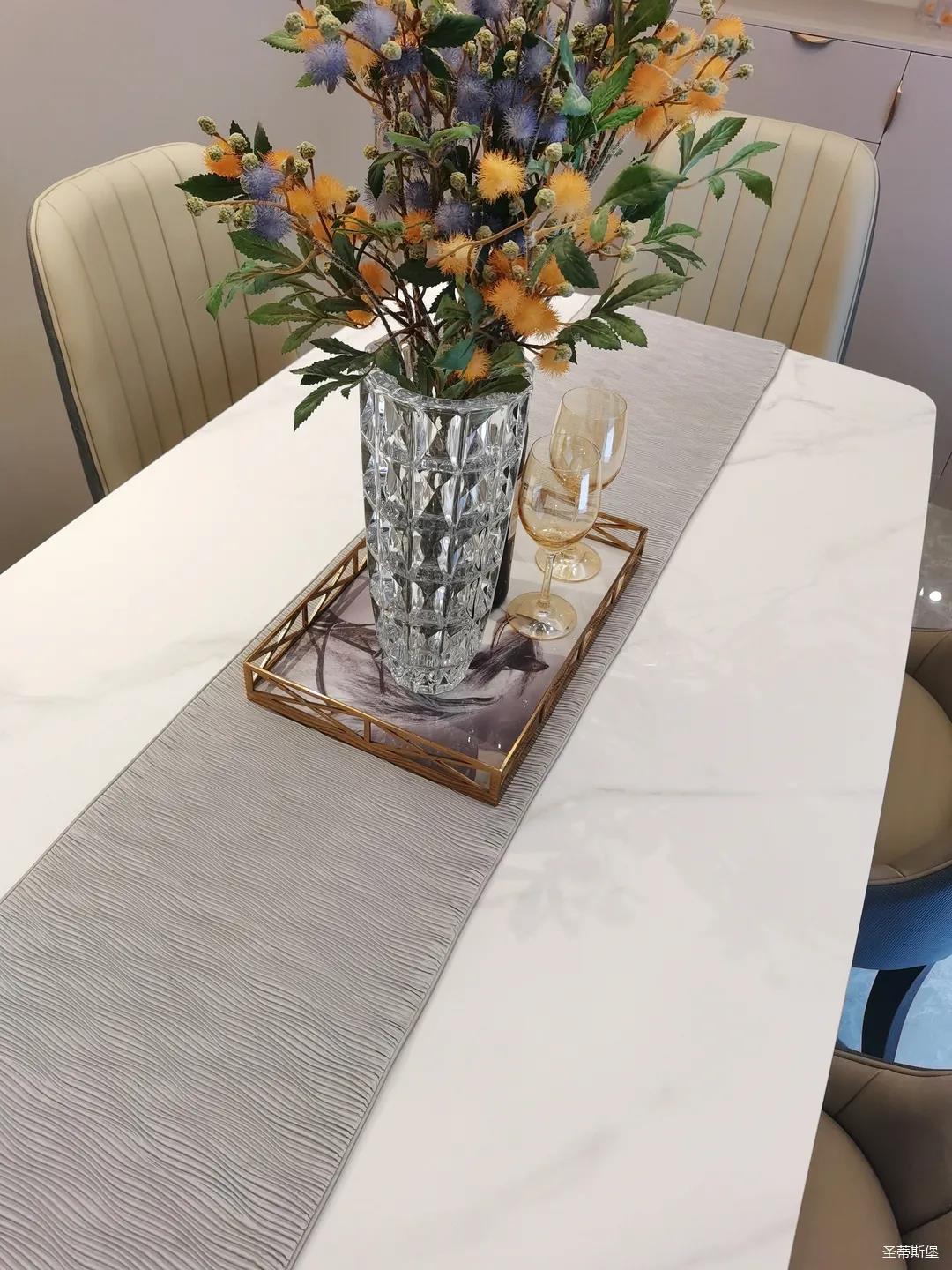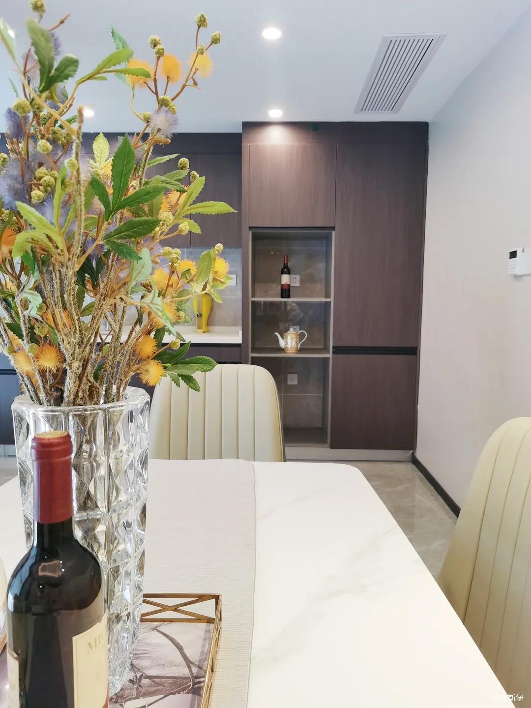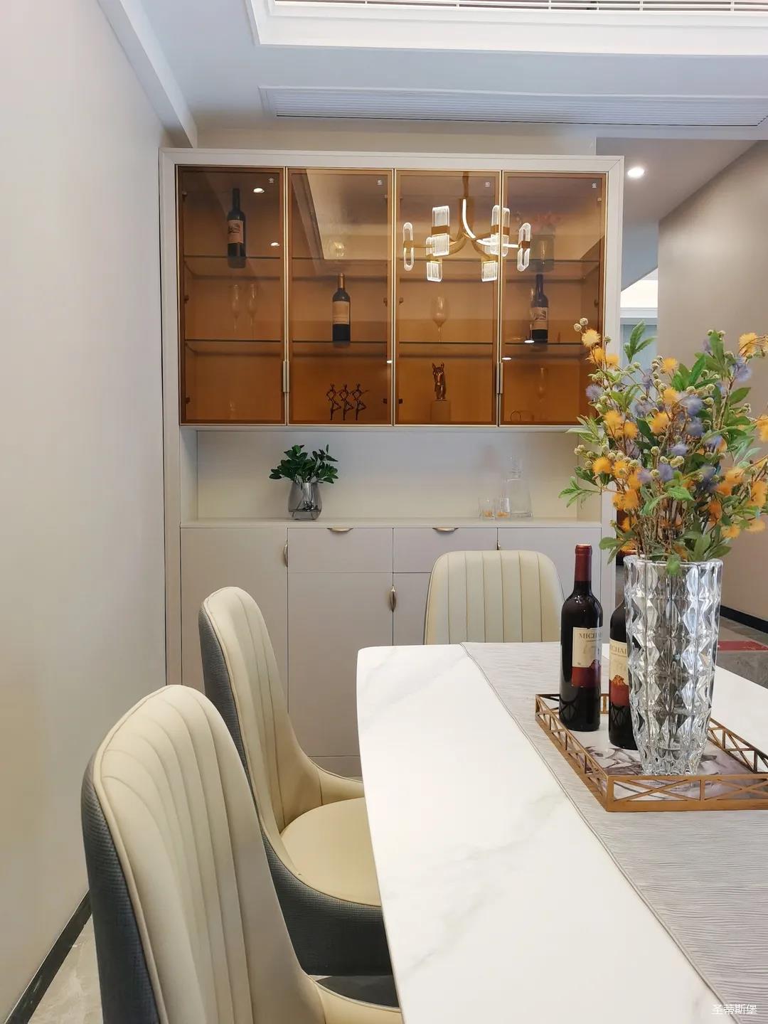 客餐廳雖屬同層,但由廊道隔開(kāi),各有寬闊的空間格局,加上引入自然光源的采光設(shè)計(jì),空間通透明亮。巖板餐桌搭配的真皮餐椅,讓不同的材質(zhì)在在空間完美契合,既增加了空間的時(shí)尚氛圍,也能給人良好的用餐體驗(yàn)。