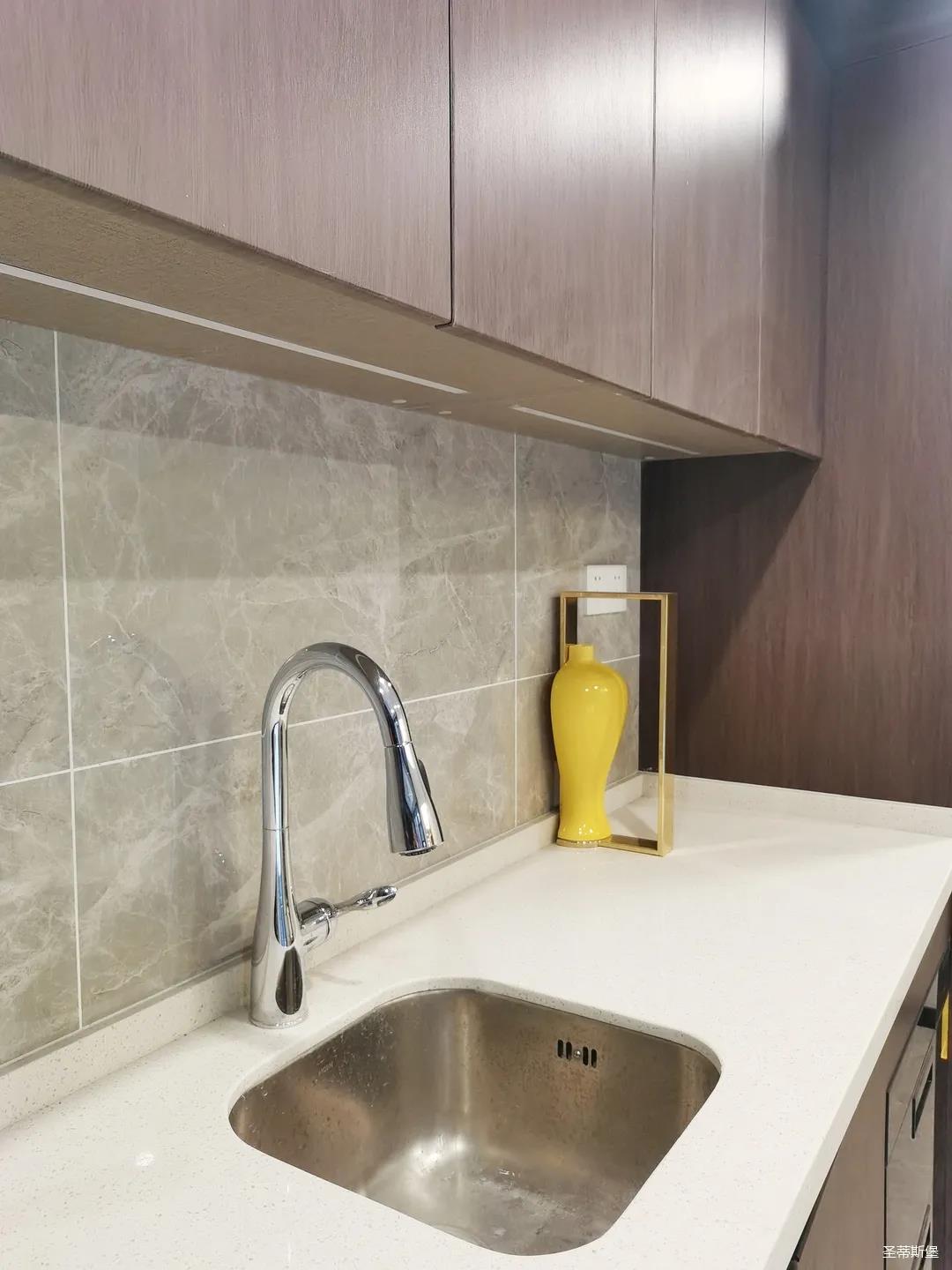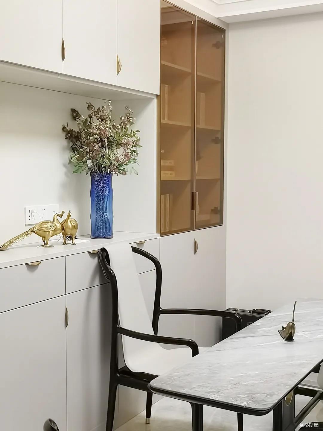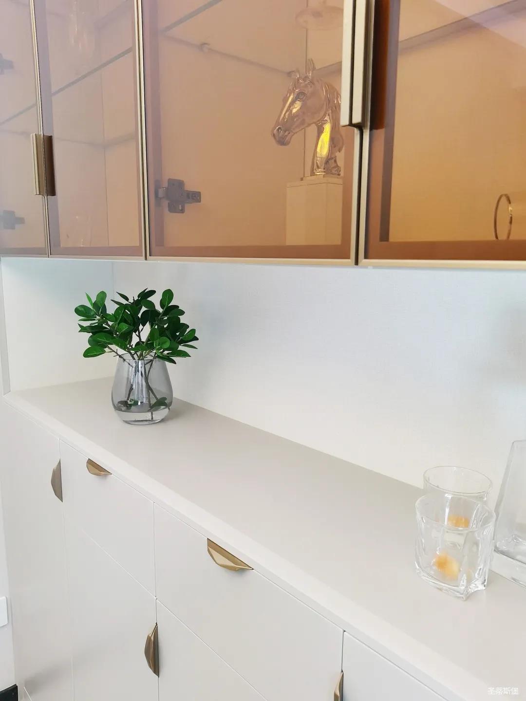 開(kāi)放式的餐廚設(shè)計(jì)讓餐邊柜和櫥柜的居家動(dòng)線(xiàn)更為流暢,成了最便利的收納場(chǎng)所,生活小資而又美好。