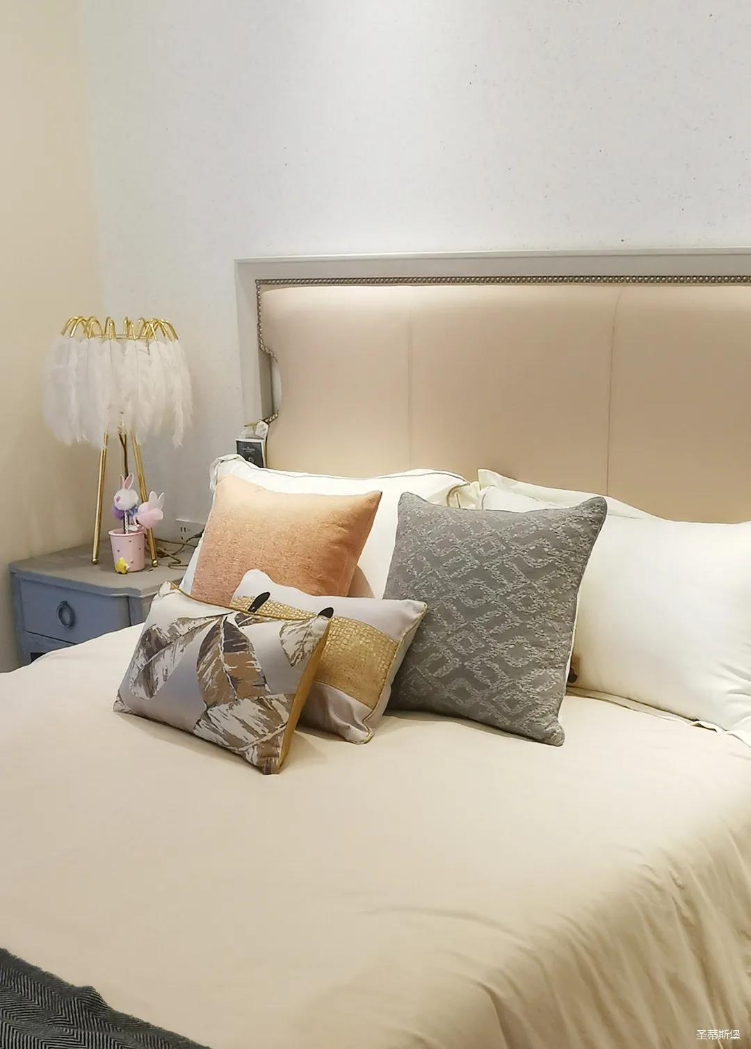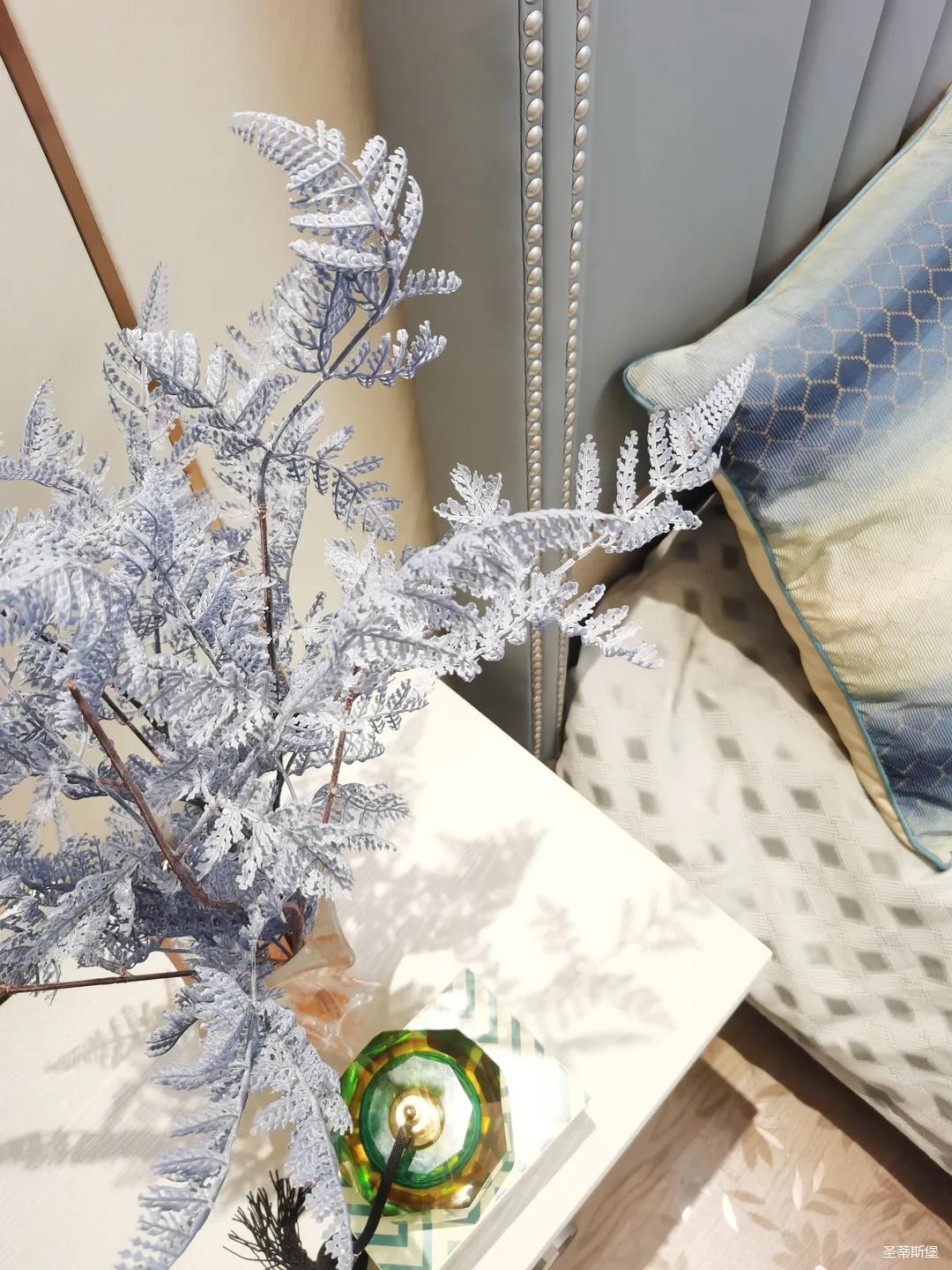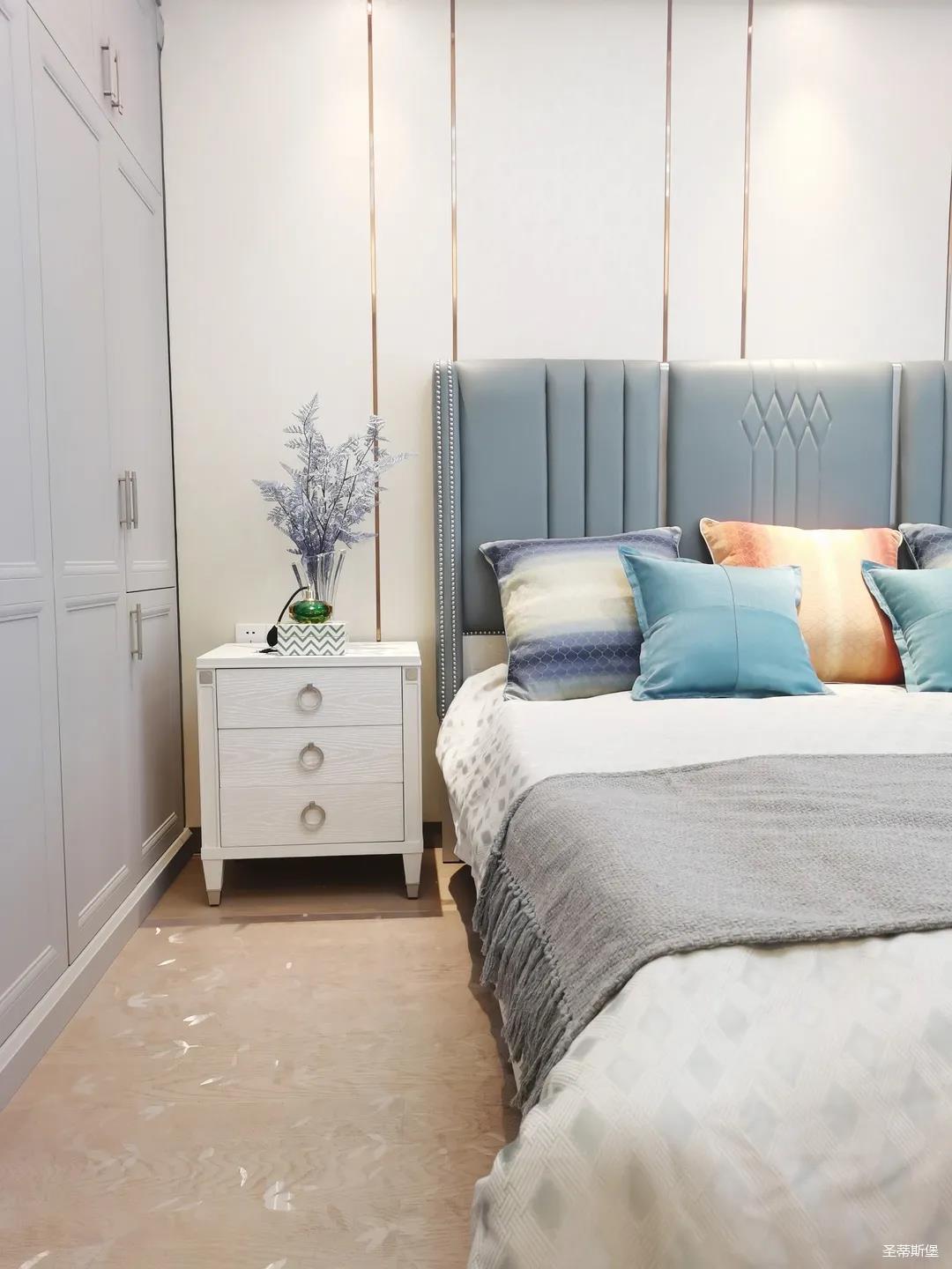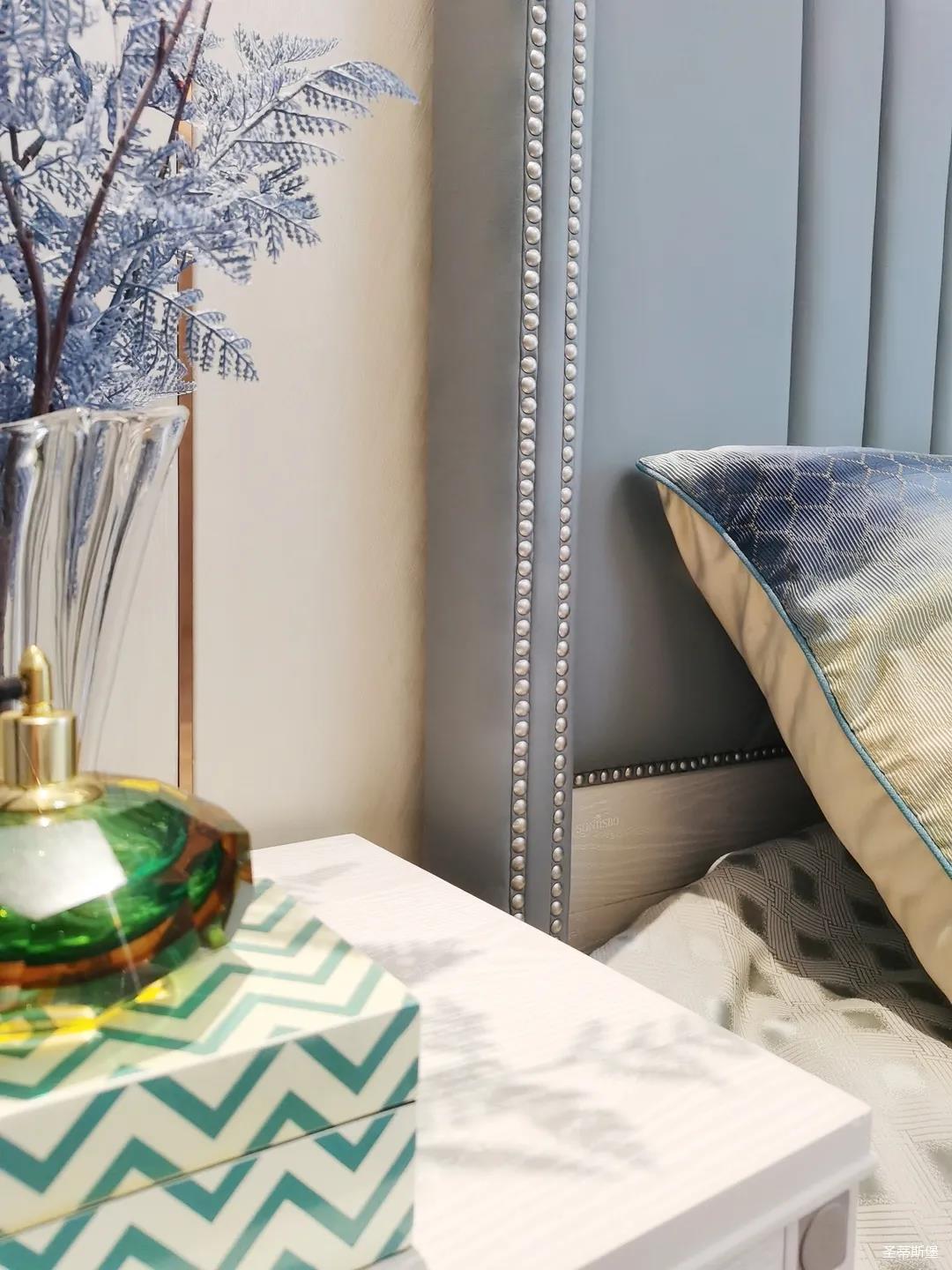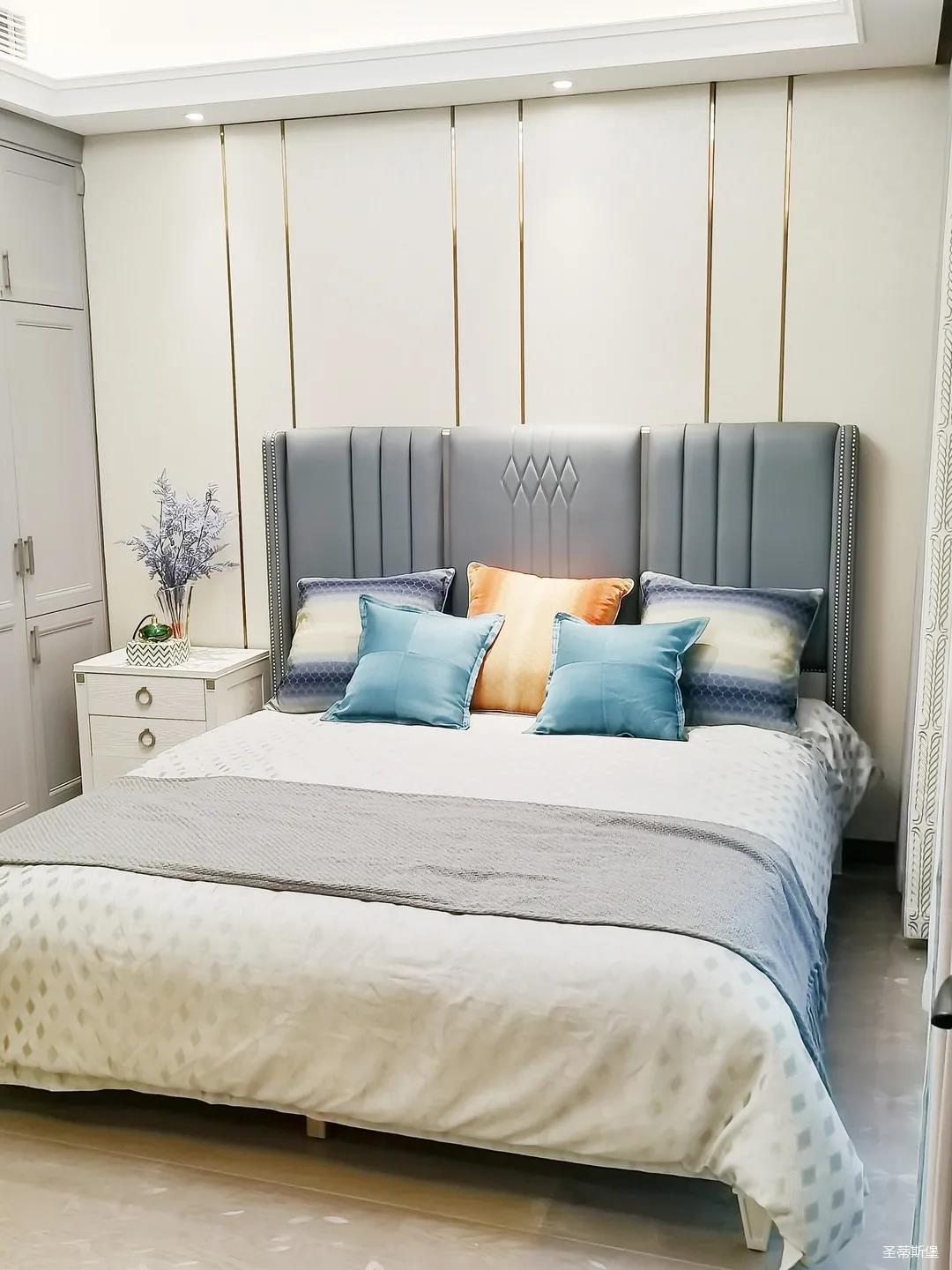 一樓的房間業(yè)主是作為長(zhǎng)輩房,采用輕奢的背景墻面,結(jié)合亮眼的金屬線(xiàn)條設(shè)計(jì),空間顯得時(shí)尚又不失沉穩(wěn)。莫蘭迪色的淺藍(lán)床屏,在無(wú)主燈設(shè)計(jì)與自然光線(xiàn)的碰撞下醞釀出不同的光影美感。