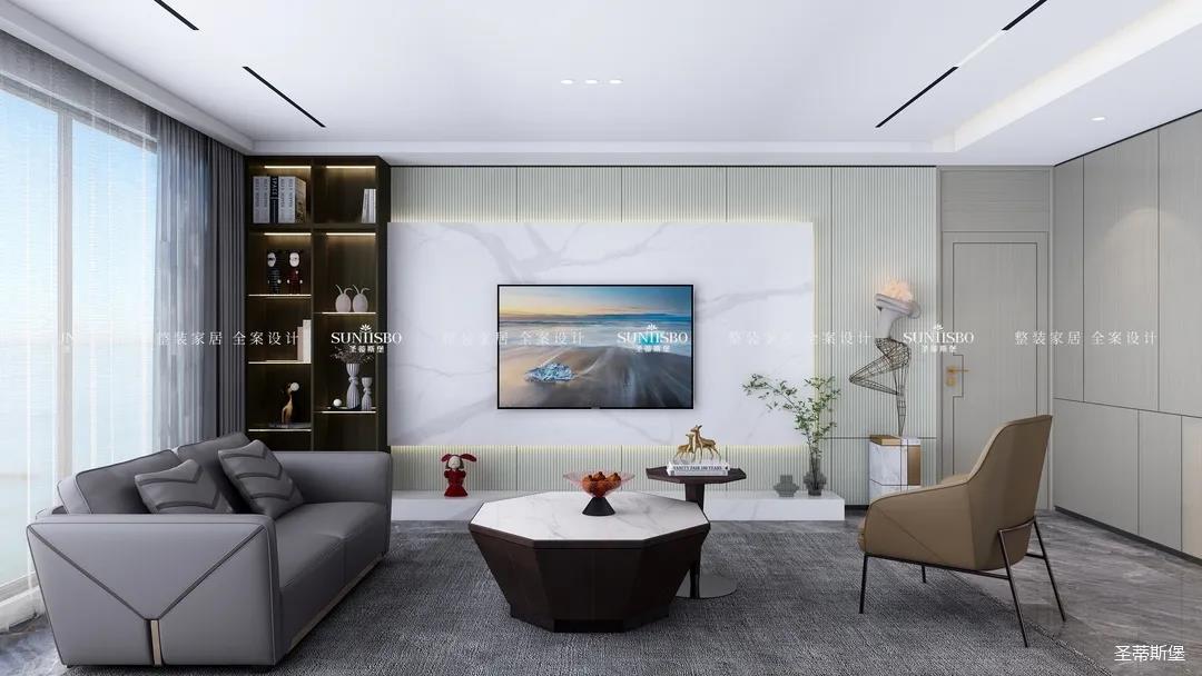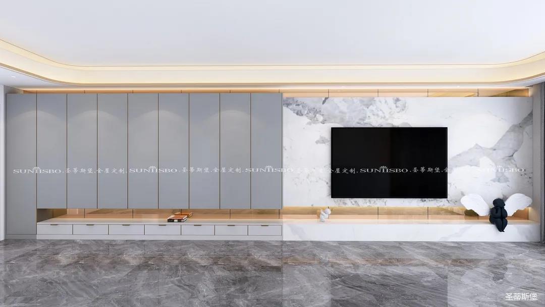 它以英倫爵士灰為柜體主調(diào),背景墻定制了整墻的儲物柜,色調(diào)懷舊復古的同時還夾帶著時尚摩登氣息,明暗收納合理分區(qū),電視被實木飾面包圍,使空間視覺得以延伸,美觀收納兩不誤。