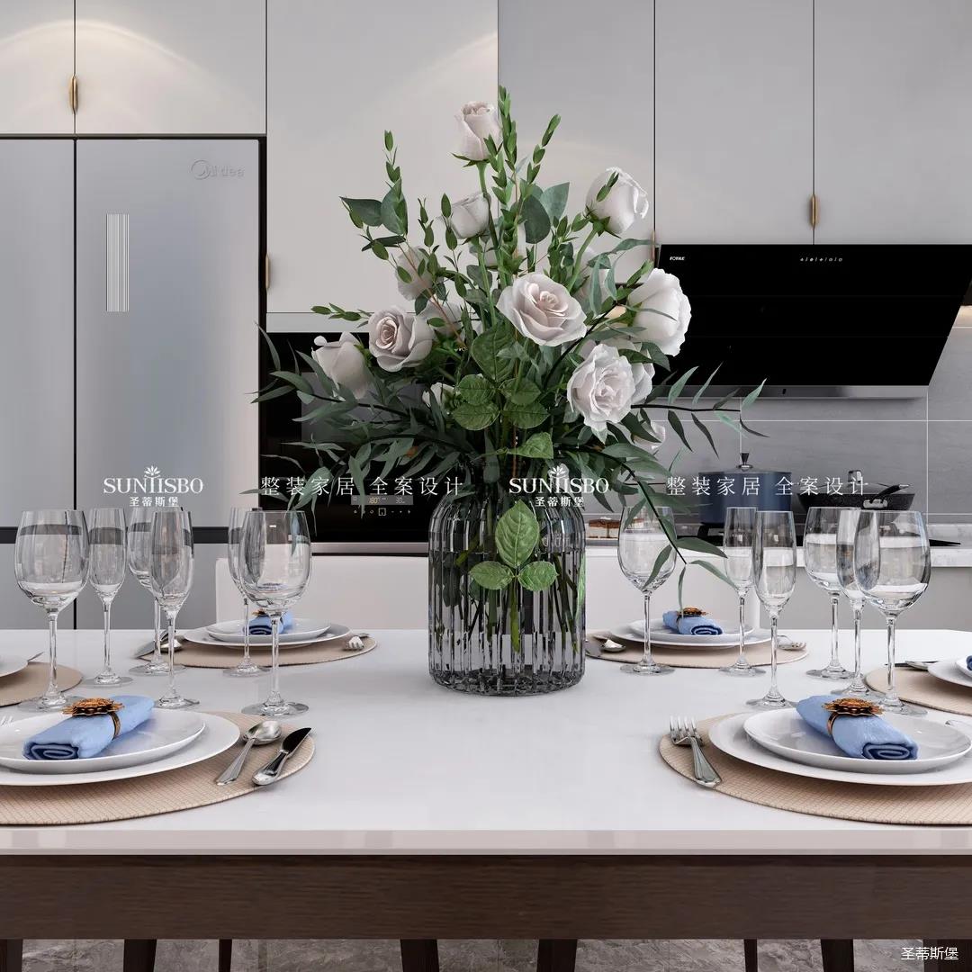 餐廳中大理石肌理的桌面自然袒露,自然親膚的觸感、皮革質(zhì)感的現(xiàn)代餐椅坐感舒適自然。沉穩(wěn)的實(shí)木材質(zhì)延伸,精致的瓷白餐盤搭配金屬質(zhì)感的物件,通透的玻璃器皿點(diǎn)綴其中,契合了業(yè)主對(duì)品質(zhì)生活的追求。