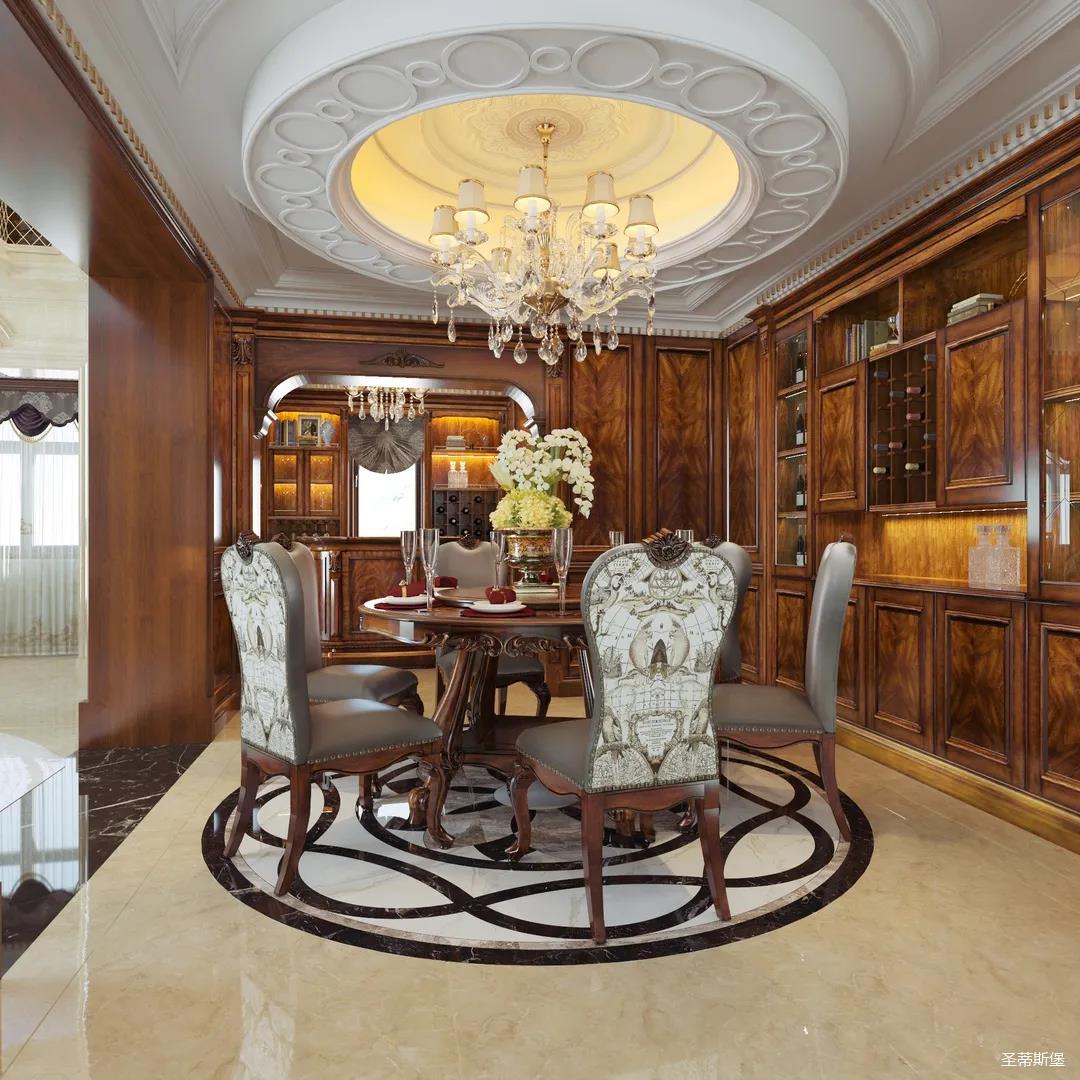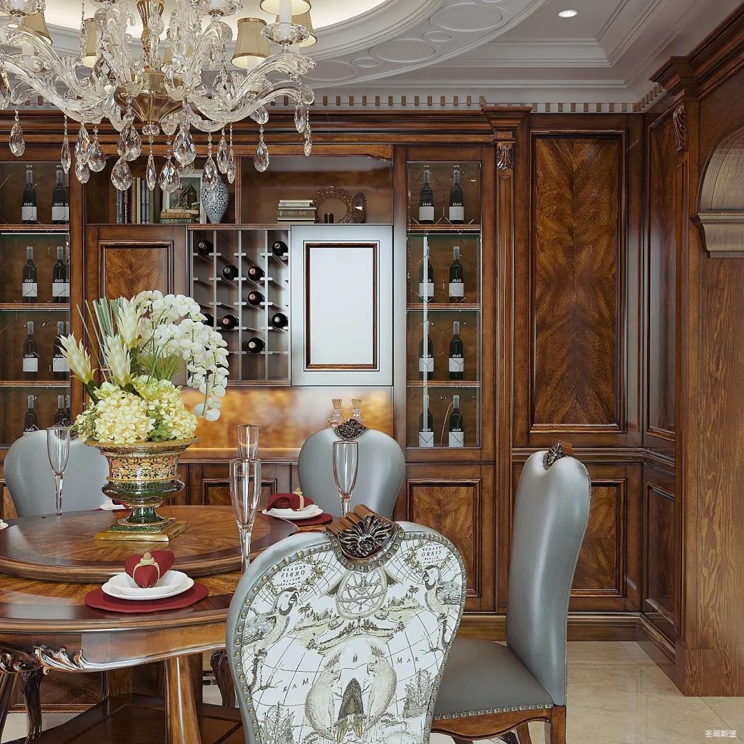 女業(yè)主是留美歸來,非常喜歡美式用餐氛圍,設(shè)計(jì)師以懷舊雅致作為室內(nèi)基調(diào),整體定制柜與護(hù)墻,都透著美式的自然懷舊,即使褪去家具軟裝,僅存留硬體結(jié)構(gòu),仍透散著優(yōu)雅純凈的美式韻味。