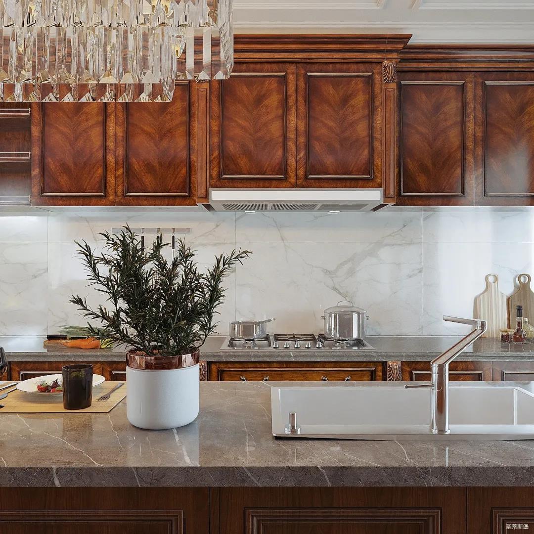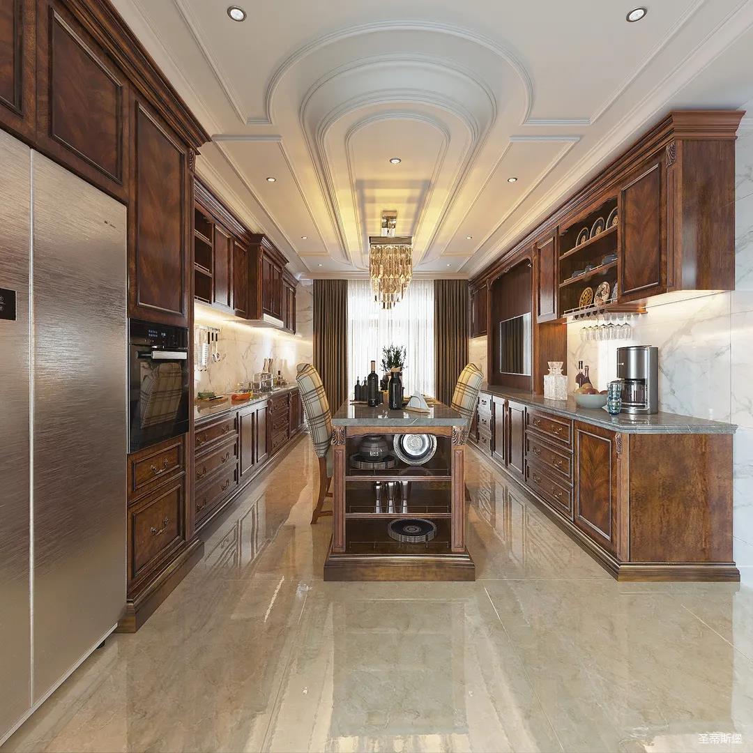 西廚設(shè)計(jì)更為統(tǒng)一,女業(yè)主喜好柔美優(yōu)雅的視覺效果,因此設(shè)計(jì)師特意將吊頂轉(zhuǎn)角做了圓弧處理,使冷峻的空間略帶圓潤,形成精致協(xié)調(diào)的空間格局。簡(jiǎn)潔的石膏吊頂與吧臺(tái)一致延伸,讓廚房視覺空間得以擴(kuò)大。金屬元素水晶吊燈,增加了空間的精致感,美式定制柜體將古典元素與現(xiàn)代電器相糅合,交錯(cuò)產(chǎn)生一種自然的違和感。