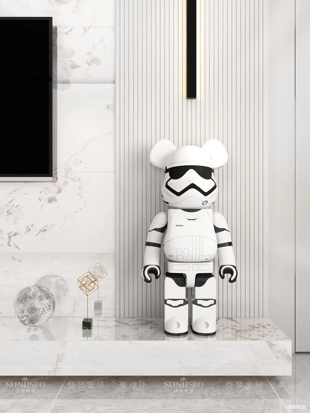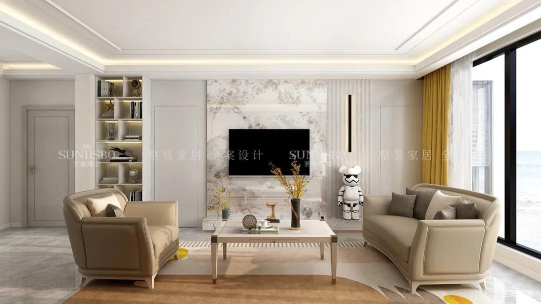 客廳設(shè)計置頂展示柜和大理石,實現(xiàn)了現(xiàn)代和輕奢風格間的均衡組合。溫柔莫蘭迪色調(diào)的沙發(fā),細節(jié)的實木底座和人性化的環(huán)抱式設(shè)計讓空間更添溫馨的氣息。