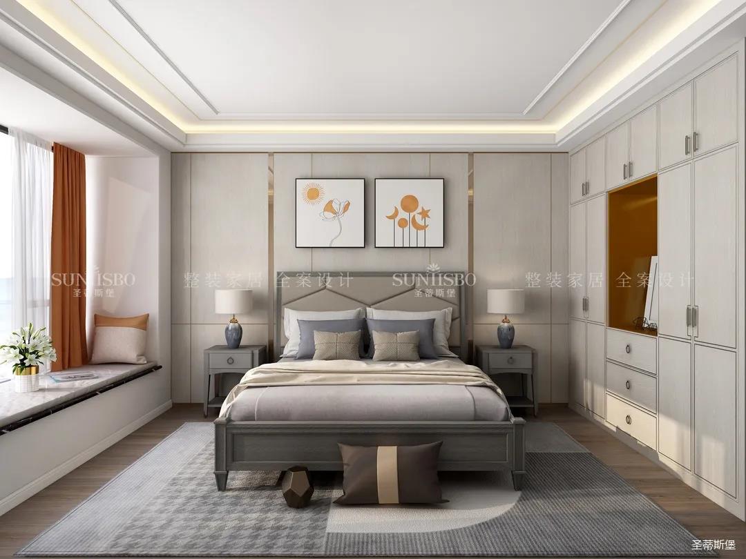 主臥隨著優(yōu)雅的金屬線條鋪開,臥室內(nèi)的靜謐感有序的傳遞著,帶有溫度的木飾面與溫潤的實木地板在同一空間交匯,充滿輕奢質(zhì)感。明亮橙的色彩點綴讓空間活躍的格調(diào)不斷擴充,仿古白的定制柜體在空間形成若隱若現(xiàn)的視覺平衡,將溫暖,柔和組合成日常的睡眠氛圍。