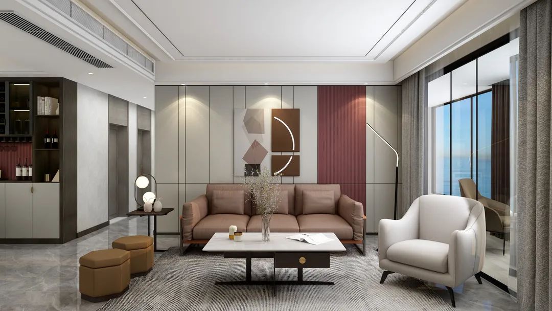 沙發(fā)皮色采用深淺不一的咖色拼接。讓空間顯得精致有質(zhì)感。在沙發(fā)的扶手邊框、底座,融入了愛(ài)馬仕橙,讓空間多了些靈動(dòng)的生活氣息。搭配簡(jiǎn)約單椅,給人一種視覺(jué)上的高級(jí)感。