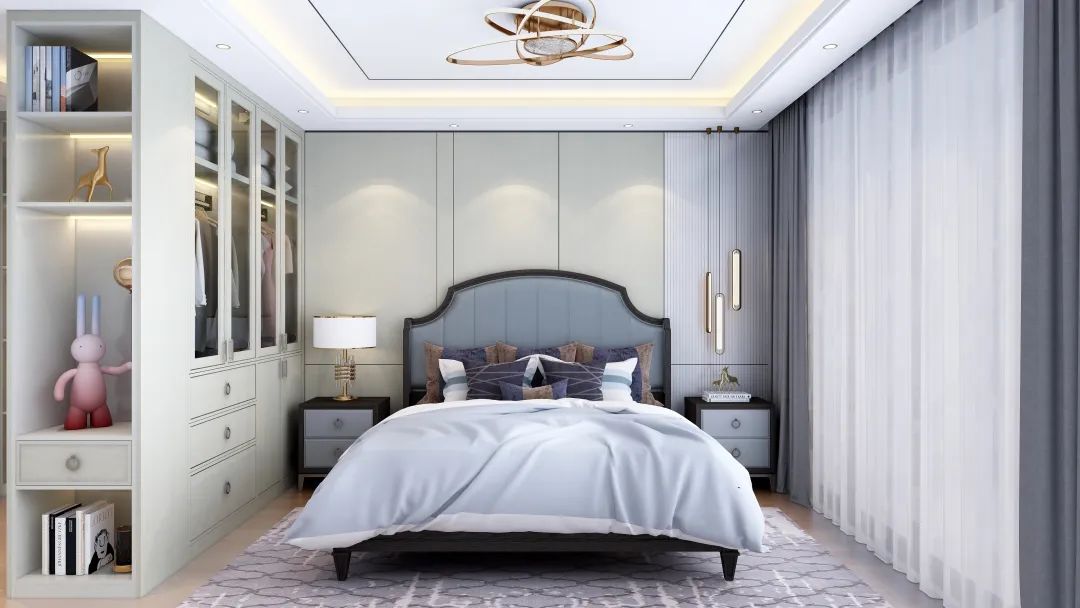 淡藍(lán)色也是冷靜色,可以使人更加容易入睡。床屏的邊緣采用了鉚釘鑲嵌,在光線照射下可提亮空間,使床屏看起來(lái)更加精致,更有輕奢的高級(jí)感。