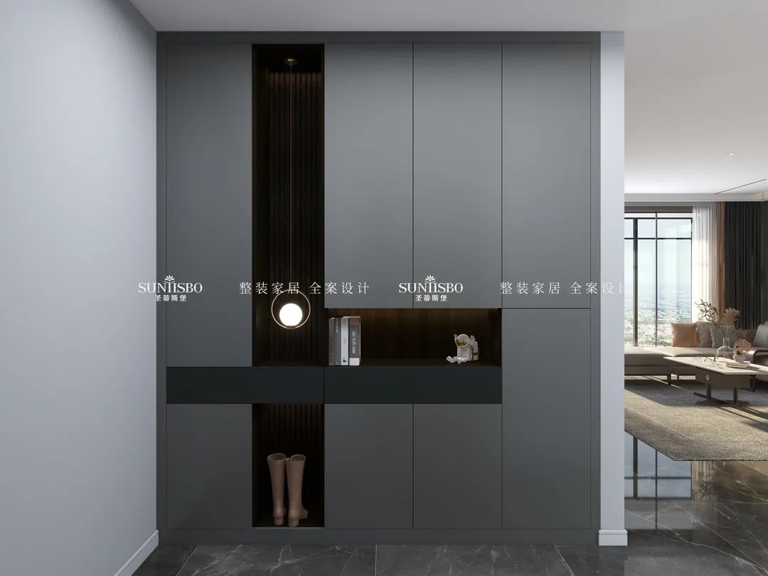 入口玄關(guān)處講究極致簡(jiǎn)潔,摒棄繁雜的設(shè)計(jì)元素,地面磚體采用與柜體相近的色調(diào),在界面轉(zhuǎn)折的地方著重連貫統(tǒng)一,讓入戶空間呈現(xiàn)科技立體感,趣味十足的藝術(shù)品擺放,使整體顯得高級(jí)又有顏值。在其中通過(guò)點(diǎn)狀燈光設(shè)計(jì),帶來(lái)躍動(dòng)而富有生命力的視覺焦點(diǎn),展現(xiàn)出現(xiàn)代時(shí)尚感。