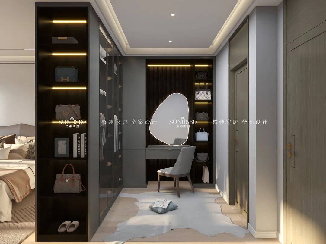 擁有一個(gè)專屬衣帽間是很多女生的夢(mèng)想。設(shè)計(jì)師回歸生活本質(zhì),究其外,是空間;究其內(nèi),是材質(zhì)、燈光,內(nèi)外融合,比例和諧。通過(guò)不規(guī)則狀的玻璃鏡面設(shè)計(jì),在時(shí)尚高級(jí)的定制空間中,傾訴著創(chuàng)意的真實(shí)和溫度,不僅擴(kuò)大了衣帽間視覺范圍,同時(shí)也給予了空間個(gè)性鮮明的藝術(shù)格調(diào)。